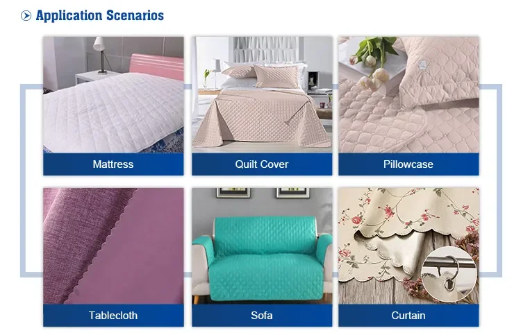 It is able to produce various chemical fiber fabrics as well as the combination of artificial leather and glue-spreadingcotton, non-woven fabrics or needle-punched cotton, with freely designed decorative pattern..lt can also producesuch fabrics as clothing,bedspread,pillow and sofa,together with upholstery.